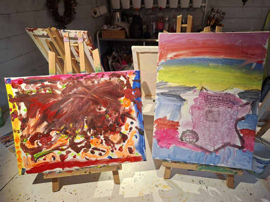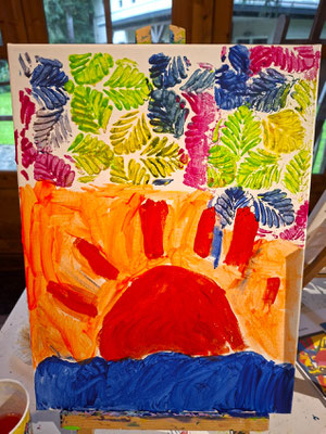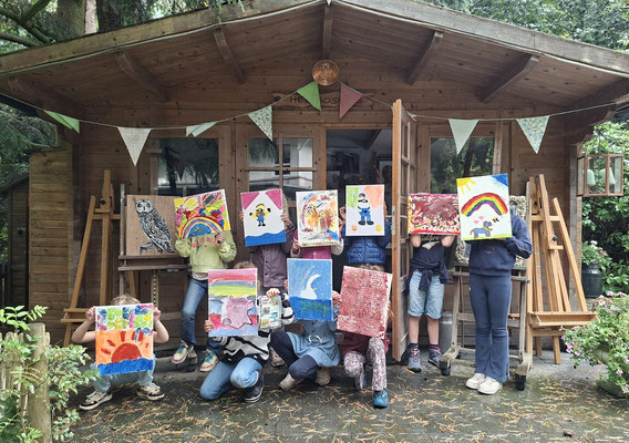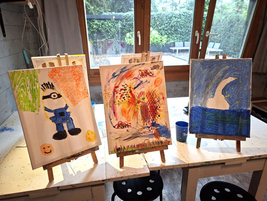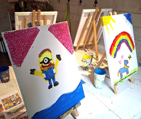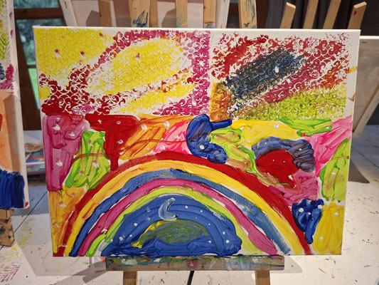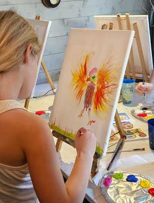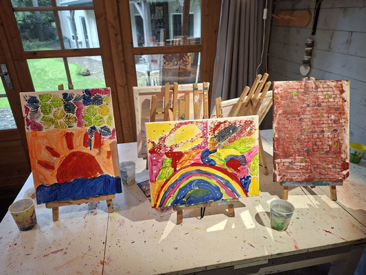 Alle kinderen krijgen een schildersezel en een canvasdoek (30 x 40 cm). Dan vertel ik kort iets over de Cobrakunst en de expressionistische manier van schilderen. Dit betekent dat we vooral schilderen vanuit gevoel en met vrolijke kleuren. Je schilderij hoeft niet te lijken of iets voor te stellen. Je maakt gewoon wat jij leuk vindt op een vrije manier. Als je liever met je handen schildert dan mag dat ook. Verder zijn er ook andere hulpmiddelen, zoals sjablonen en stempels die je erbij kunt gebruiken. Het gaat vooral om het plezier dat we beleven aan het schilderen.